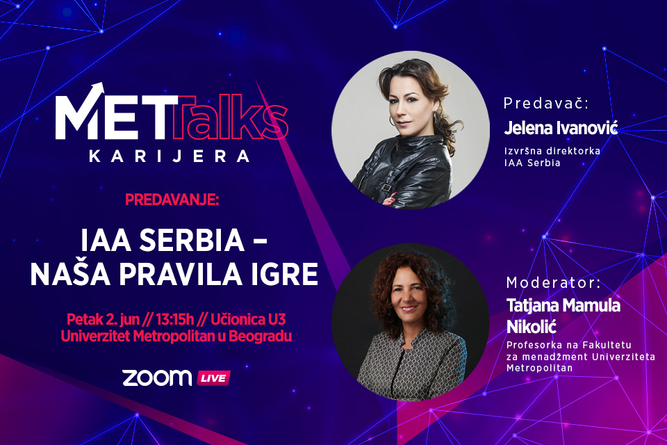 30.05.2023.U okviru projekta Univerziteta Metropolitan „MET Talks“ ugostićemo Jelenu Ivanović, izvršnu direktorku IAA Serbia, koja će govoriti o kompaniji u kojoj radi, o tome kakvu ulogu i odgovornost imaju strukovne asocijacije? Kako je IAA shvatio svoju i na koji način je sprovodi.