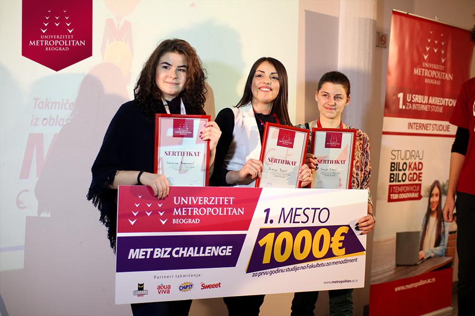 20.03.2017.Vikend na Univerzitetu Metropolitan je bio rezervisan za „Met Biz Challenge“ i pobedu koju su odnele učenice 3 godine srednje Ekonomske škole iz Leskovca. Sanja Cakić, Emilija Dunčić i Kristina Anđelković su pokazale kako izgleda jedan tim koji veruje u svoju ideju. Način na koji su ove mlade dame prezentovale svoj rad i „Foto Cube Book“ za izdavačku kuću Laguna je oduševio žiri i obezbedio im prvo mesto na ovom takmičenju, uz vrednu nagradu od 1000€ za prvu godinu studija na Fakultetu za Menadžment, Univerziteta Metropolitan.