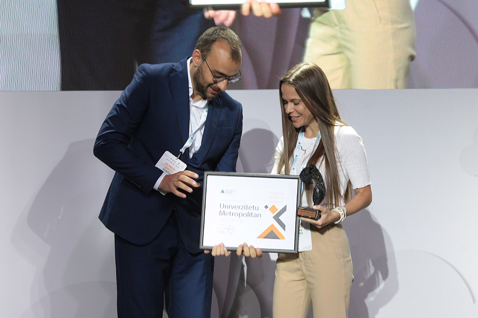 27.05.2022.U okviru Nacionalnog takmičenja učeničkih kompanija, 24. maja održana je svečana ceremonija dodele godišnjih nagrada Dostignuća mladih, za poseban doprinos koji su pojedinci, organizacije i korporacije dali razvoju preduzetničkog obrazovanja u Srbiji. Univerzitetu Metropolitan dodeljeno je priznanje za IZUZETAN DOPRINOS RAZVOJU PREDUZETNIČKOG OBRAZOVANJA U SRBIJI! Nemanja Glavnić ovom prilikom priznanje je dodelio predstavnici Univerziteta Metropolitan Andrei Vukomanov.