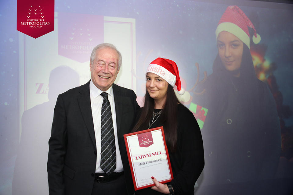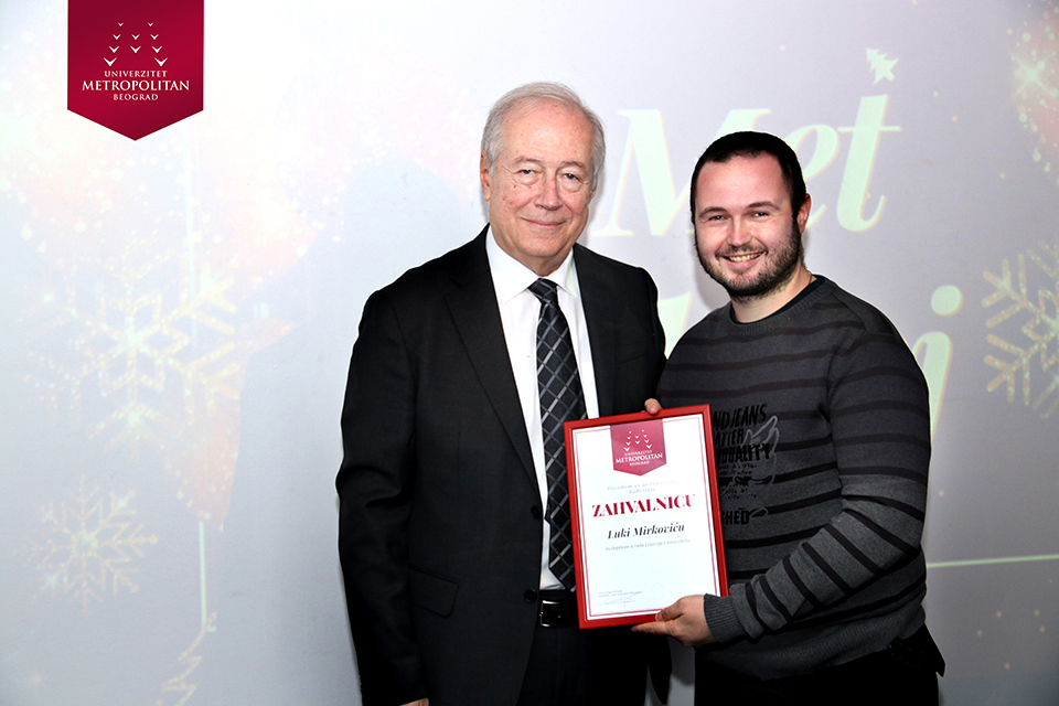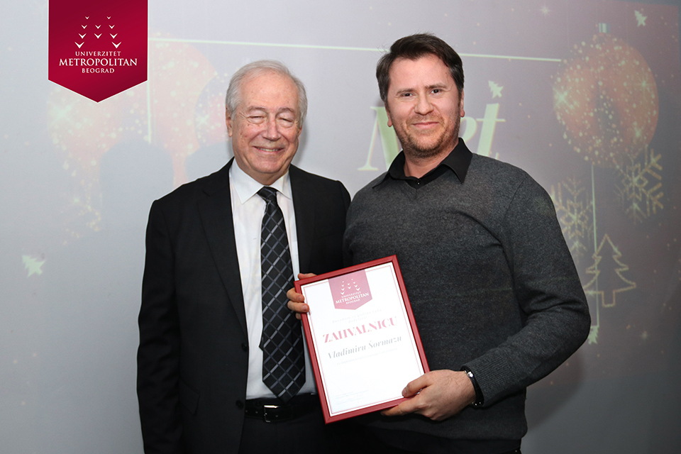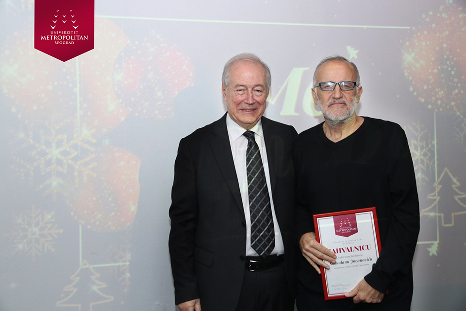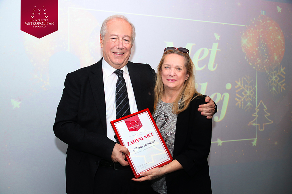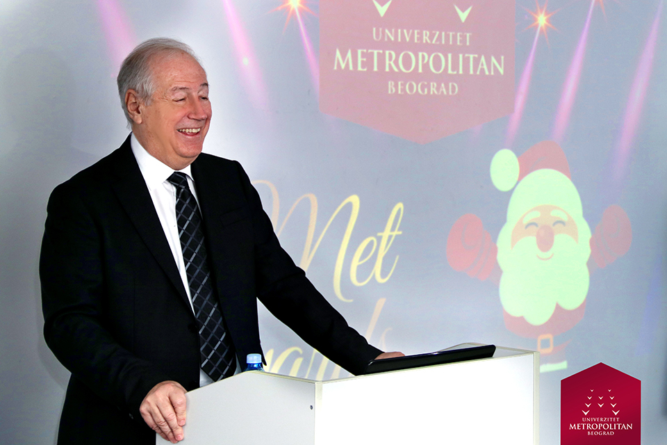 Predsednik i rektor Univerziteta Metropolitan, profesor dr Dragan Domazet se obratio prisutnima, čestitao svima na uspešnoj godini koja je iza nas, benefitima koji su ostvareni zajedničkim trudom i svečano uručio povelje i zahvalnice.