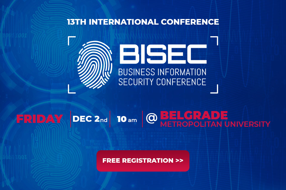 Univerzitet Metropolitan i Udruženje eSigurnost organizuju 13. Međunarodnu konferenciju o bezbednosti poslovnih informacija (BISEC’2022), koja će se održati 2. decembra 2022. godine na Univerzitetu Metropoliten u Beogradu.