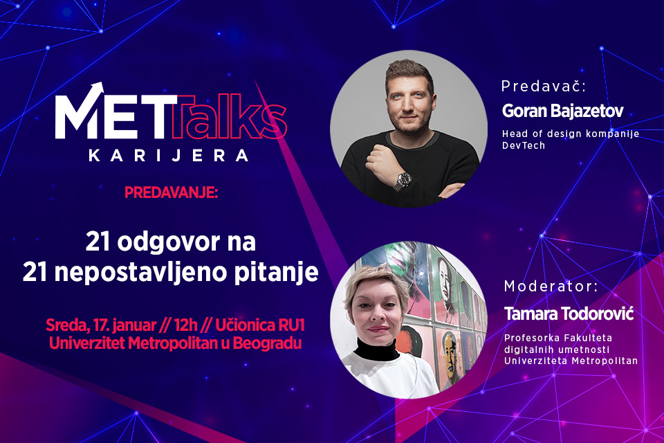 16.01.2024.U okviru projekta Univerziteta Metropolitan „MET Talks“ ugostićemo Gorana Bajazetova, head of design kompanije DevTech na temu 21 odgovor na 21 nepostavljeno pitanje, a moderator predavanja biće profesorka Fakulteta digitalnih umetnosti Univerziteta Metropolitan, Tamara Todorović.