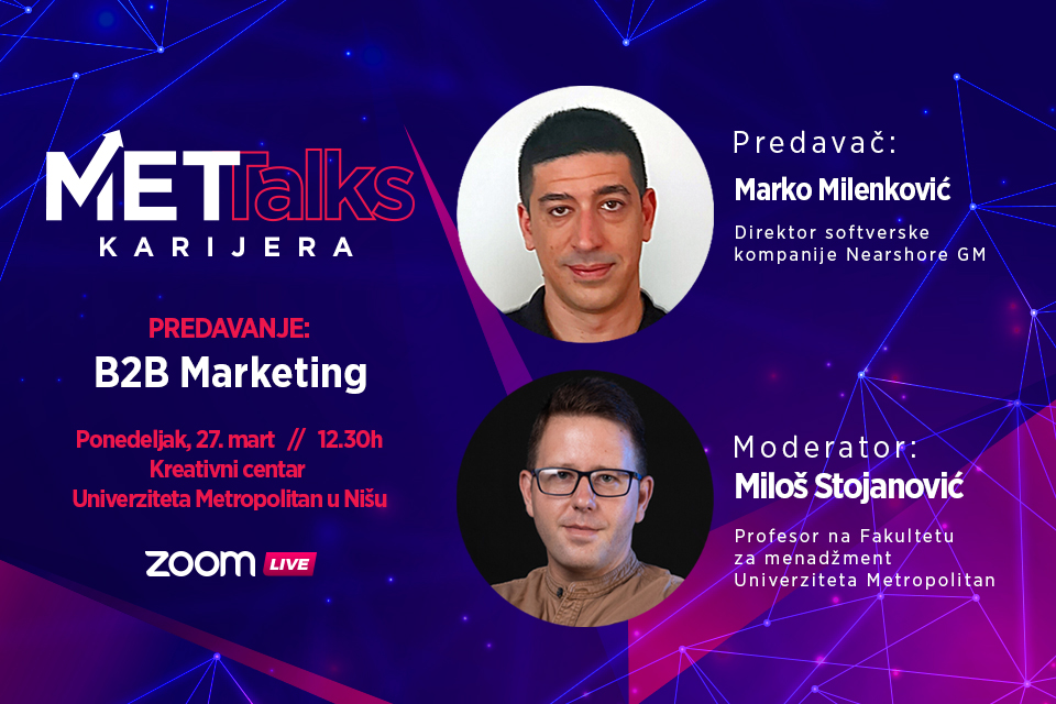 24.03.2023.U okviru projekta Univerziteta Metropolitan “MET Talks” u ponedeljka 27. marta u 12.30h ugostićemo Marka Milenkovića, je direktora softverske kompanije Nearshore GM u Nišu. Moderator će biti profesor Fakulteta za menadžment Univerziteta metropolitan, Miloš Stojanović.