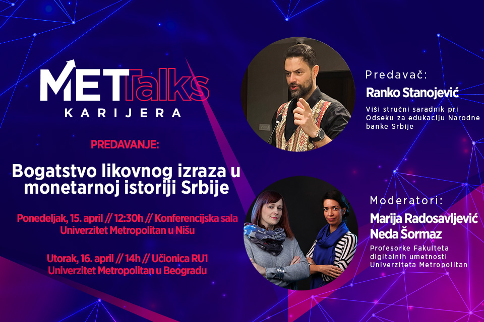 12.04.2024.U okviru projekta Univerziteta Metropolitan „MET Talks“ ugostićemo Ranka Stanojevića višeg stručnog saradnika pri Odseku za edukaciju Narodne banke Srbije na temu Bogatstvo likovnog izraza u monetarnoj istoriji Srbije, a moderatori predavanja biće profesorke Fakulteta digitalnih umetnosti Univerziteta Metropolitan, Marija Radosavljević u Nišu i Neda Šormaz u Beogradu.