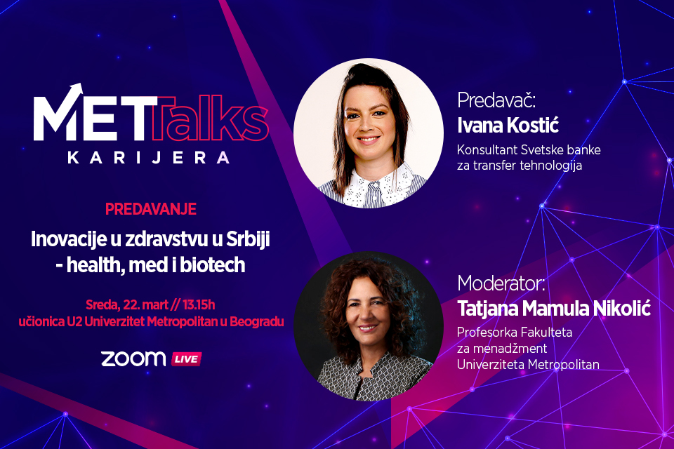 14.03.2023.U okviru projekta Univerziteta Metropolitan “MET Talks” ugostićemo Ivanu Kostić koja je trenutno konsultant Svetske banke za transfer tehnologija pri Institutu za molekularnu genetiku i genetičko inženjerstvo. Ona je i ko-osnivač Laboratorije zdravstvenih tehnologija (LZT) i trenutno direktorka istoimenog pilot superklastera u okviru USAid-ovog projekta Srbija inovira. Moderator predavanja biće Tatjana Mamula Nikolić, profesorka Fakulteta za menadžment.