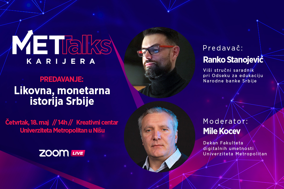 16.05.2023.U okviru projekta Univerziteta Metropolitan „MET Talks“ ugostićemo Ranka Stanojevića, višeg stručnog saradnika pri Odseku za edukaciju Narodne banke Srbije, moderator predavanja biće Mile Kocev, dekan Fakulteta digitalnih umetnosti Univerziteta Metropolitan.