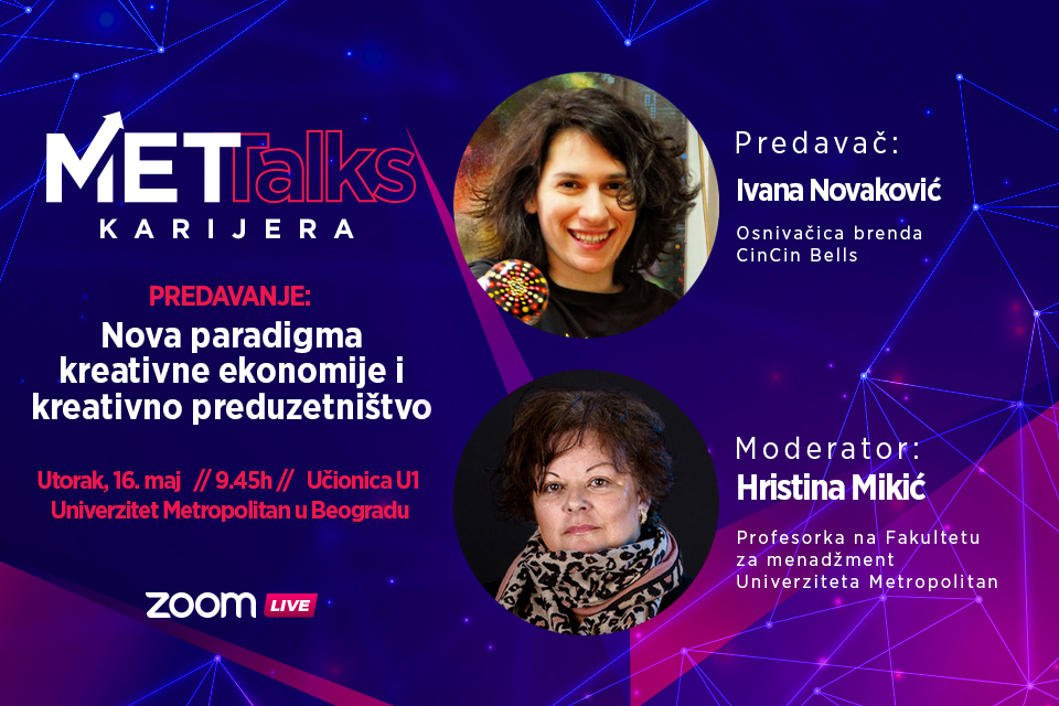 15.05.2023.U okviru projekta Univerziteta Metropolitan „MET Talks“ ugostićemo Ivanu Novaković, kreativnu preduzetnicu i osnivačicu brenda CinCin Bells. Moderator na gostujućem predavanju biće profesorka Fakulteta za menadžment, Hristina Mikić.