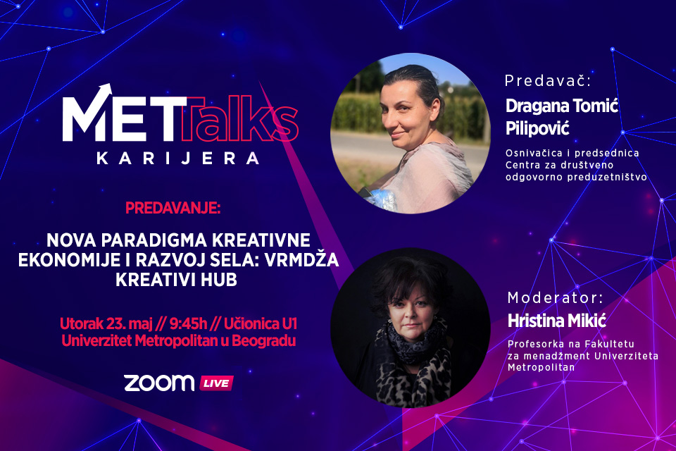 22.05.2023.U okviru projekta Univerziteta Metropolitan „MET Talks“ ugostićemo Draganu Tomić Pilipović osnivačiću i predsednicu Centra za društveno odgovorno preduzetništvo.