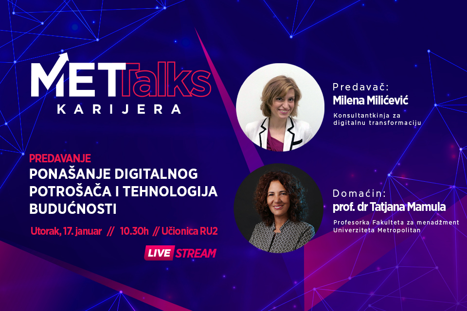 11.01.2023.U okviru projekta Univerziteta Metropolitan ,, MET Talks” ugostićemo Milenu Milićević, konsultantkinju za digitalnu transformaciju, poslovna savetnica i mentorka u programima kompanija. Osnovala je neprofitnu organizaciju INAT centar. Imaćete priliku da slušate njeno predavanje na temu „Ponašanje digitalnog potošača i tehnologija budućnosti“.