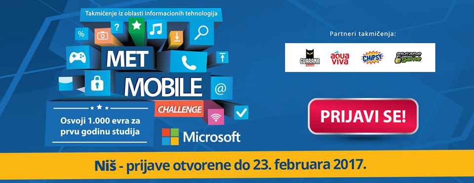 Pokaži nam dokle može da ide tvoja mašta u svetu informacionih tehnologija. Ponudi najkreativniji predlog aplikacije za mobilni telefon i osvoji vaučer za studije na Fakultetu informacionih tehnologija Univerziteta Metropolitan. Partner takmičenja je kompanija Microsoft Srbija.