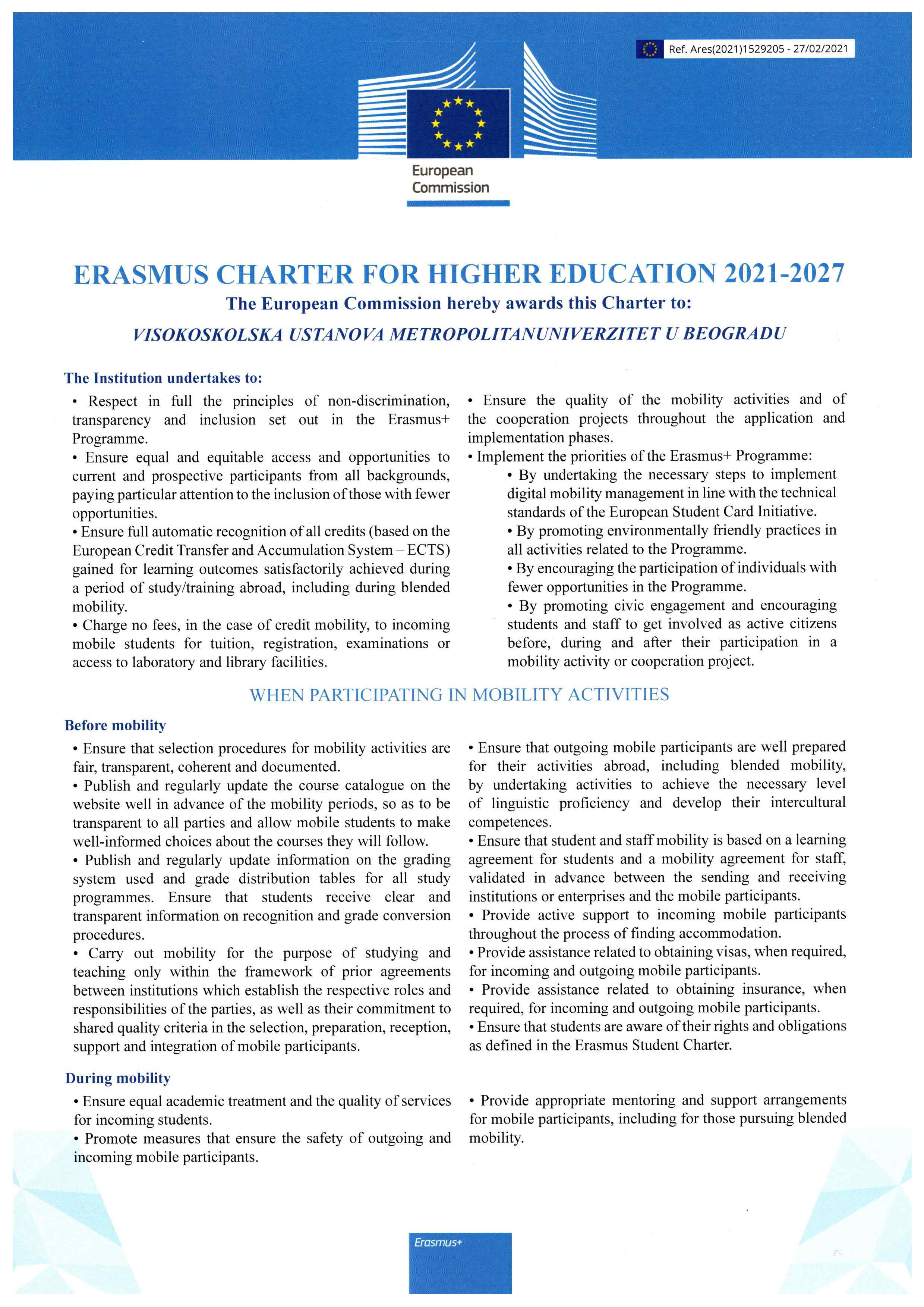 ERASMUS povelja za visoko obrazovanje 2021 – 2027 dodeljena Univerzitetu Metropolitan