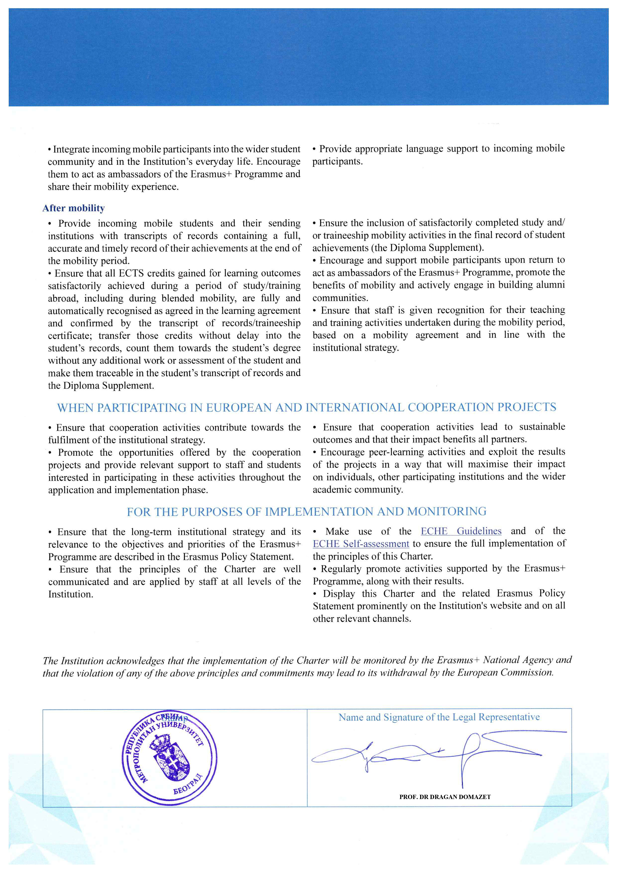 Univerzitet Metropolitan je jedan od domaćih univerziteta koji je zahvaljujući brojnim Erasmus + projektima na kojima učestvuje, kao i dobro postavljenim mehanizmima i jasnom strategijom internacionalizacije prepoznat i dobio je mogućnost da i dalje radi na svom međunarodnom razvoju. Ova mogućnost nam otvara mnoga vrata mobilnosti i strateških partnerstava, koja će pre svega imati uticaj na kvalitet studiranja naših studenata i na poboljšanju rada naših istraživača.