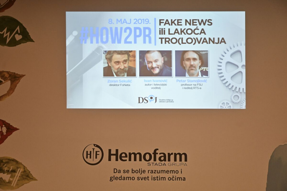 9.05.2019.Održan je prvi How2PR u organizaciji Društva Srbije za odnose s javnišću, na temu Fake news ili lakoća tro(lo)vanja. Izuzetno zanimljiv panel čiji je moderator bila profesorka Univerziteta Metropolitan, dr Milica Slijepčević, a na kome su učestvovali Zoran Sekulić, direktor agencije FoNet, Ivan Ivanović, voditelj i Petar Stanojlović, profesor na FDU i reditelj RTS-a.