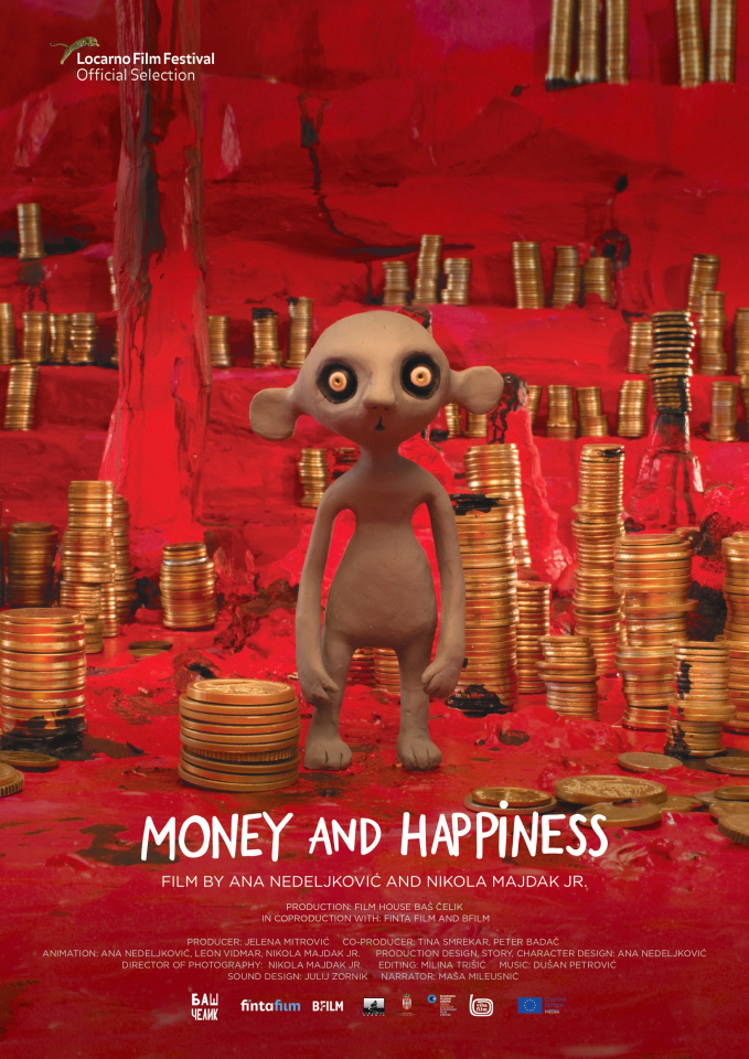 Film „O novcu i sreći“ bavi se aktuelnom temom ekonomije, kroz distopijski svet Hrčaka koji žive u i vredno rade u Hrčkolendu, savršenoj državi sa savršenom ekonomijom u kojoj BDP konstantno raste, ne postoji nezaposlenost, a 100% stanovništva izjašnjava se da je srećno. Naravno, kao i svaki pokušaj nasilnog uredjenja savršenog društva, svet Hrčaka ima i svoju mračnu stranu, koju postepeno otkrivamo tokom filma. Film traje 10 minuta i rađen je u zahtevnoj stop motion tehnici animacije, u kojoj su korišćene plastelinske lutke.