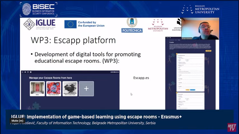 4.12.2024.U okviru ERASMUS+ IGLUE (Implementation of game-based learning using escape rooms– ref. broj: 2024-1-ES01-KA220-HED-000256356) je projekat koji je tek odobren i počinje sa svojim aktivnostima. Profesor dr Miljan Milošević prikazao plan aktivnosti na 15. Međunarodnoj konferenciji o bezbednosti informacija BISEC`2024, koja se održala u Nišu od 28. do 29. novembra. Događaj je organizovao Univerzitet Metropolitan. Glavna tema ovogodišnje konferencije je bila „Sigurnost u sistemima prediktivnog održavanja“.
