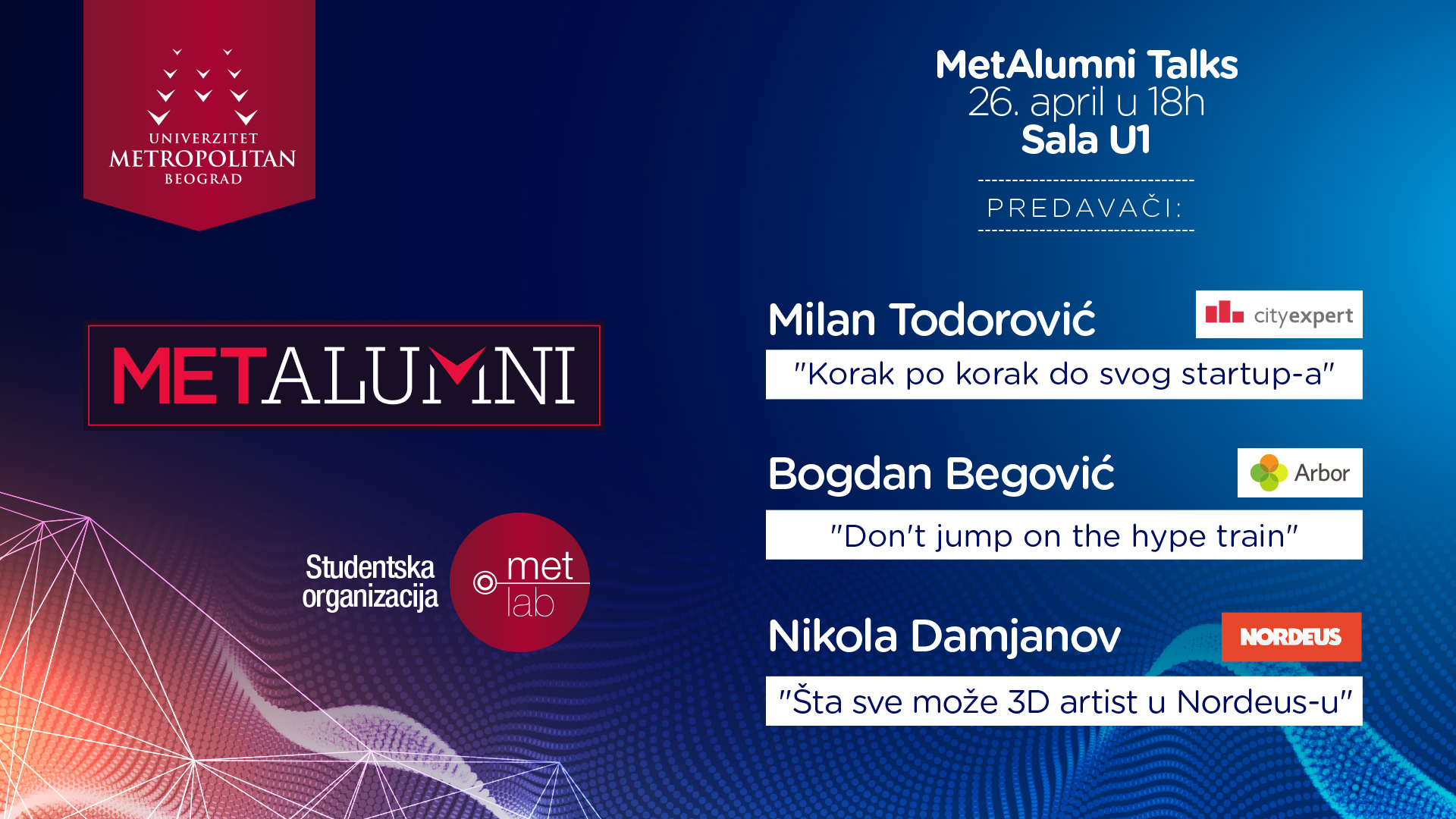 U četvrtak 26. aprila 2018. godine sa početkom od 18h na Univerzitetu Metropolitan u Beogradu, Met Lab organizuje prvi „MetAlumni Talks“. Alumnisti našeg univerziteta će održati motivaciono predavanje i govoriti o svom uspešnom poslovanju nakon završenih studija. Predavanje je namenjeno studentima, ali i svima koji žele da saznaju gde i kako posluju Metropolitan studenti nakon završenih studija. „MetAlumni Talks“ će se održati u učionici U1.