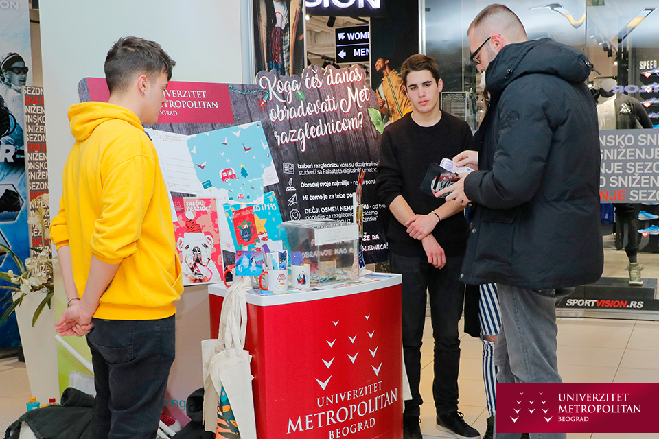 Koga ćeš danas obradovati MET razglednicom? – bio je naziv održanih humanitranih akcija, koje su bile organizovane u najposećenijim tržnim centrima: SC Ušće (Beograd) i SC Forum (Niš), u okviru kojih su se mogli naći pored MET razglednica, po simboličnim cenama i drugi, unikatni radovi studenata Fakulteta digitalnih umetnosti i neprofitabilne organizacije Artists Anonymous – cegeri, šolje, stikeri, bedževi i još mnogo toga.