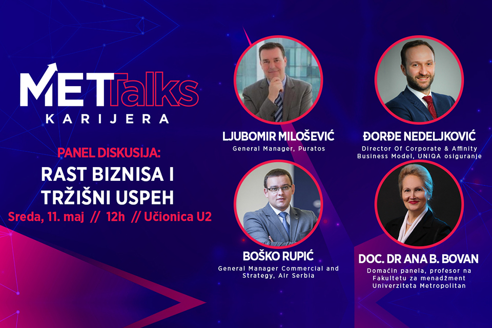 19.04.2022.U okviru projekta Univerziteta Metropolitan – „MET Talks“ održaće se panel diskusija na temu „Rast biznisa i tržišni uspeh“ sa odabranim direktorima. Učestvuju Ljubomir Milošević, General Manager, Puratos, Đorđe Nedeljković, Director Of Corporate & Affinity Business Model, UNIQA osiguranje i Boško Rupić, General Manager Commercial and Strategy, Air Serbia.