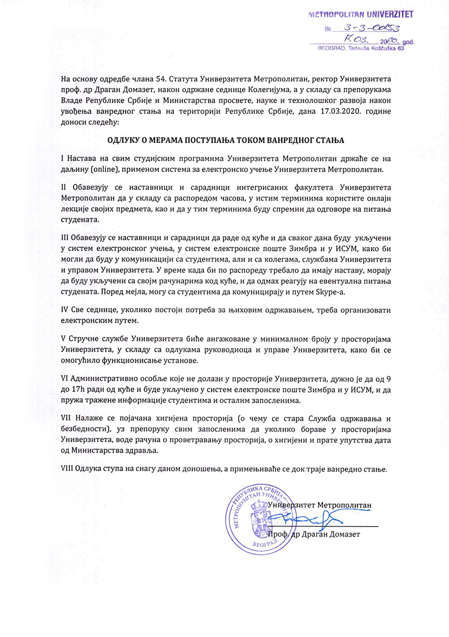 Nakon održane sednice Kolegijuma, a u skladu sa preporukama Vlade Republike Srbije i Ministarstva prosvete, nauke i tehnološkog razvoja, doneta je Odluka o merama postupanja tokom vanrednog stanja, od strane rektora Univerziteta Metropolitan, profesora dr Dragana Domazeta, a na osnovu odredbe člana 54. Statuta Univerziteta Metropolitan.