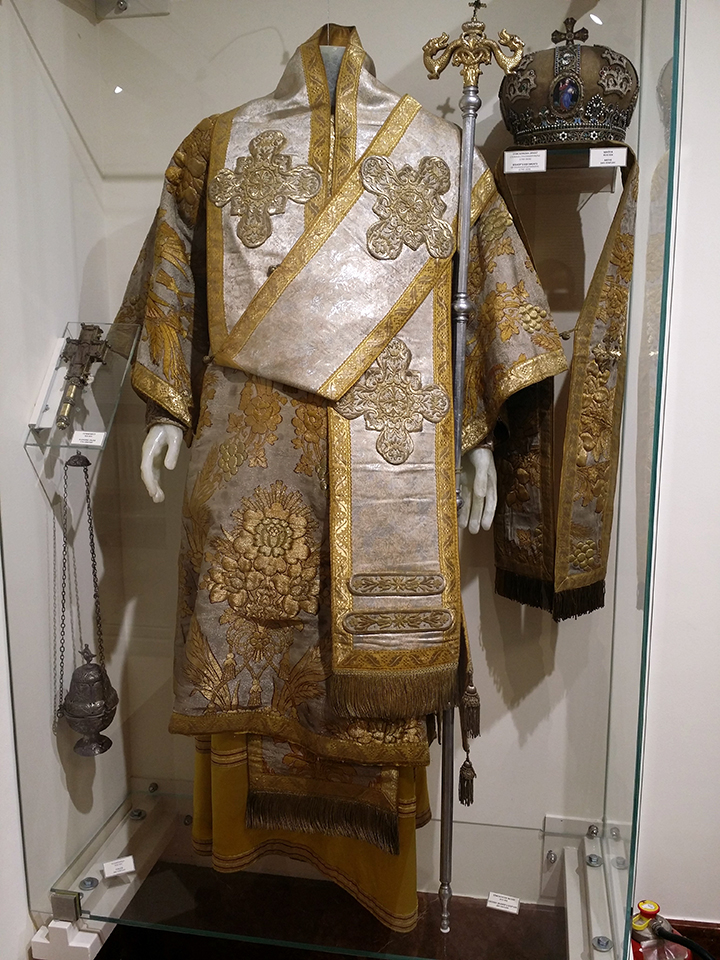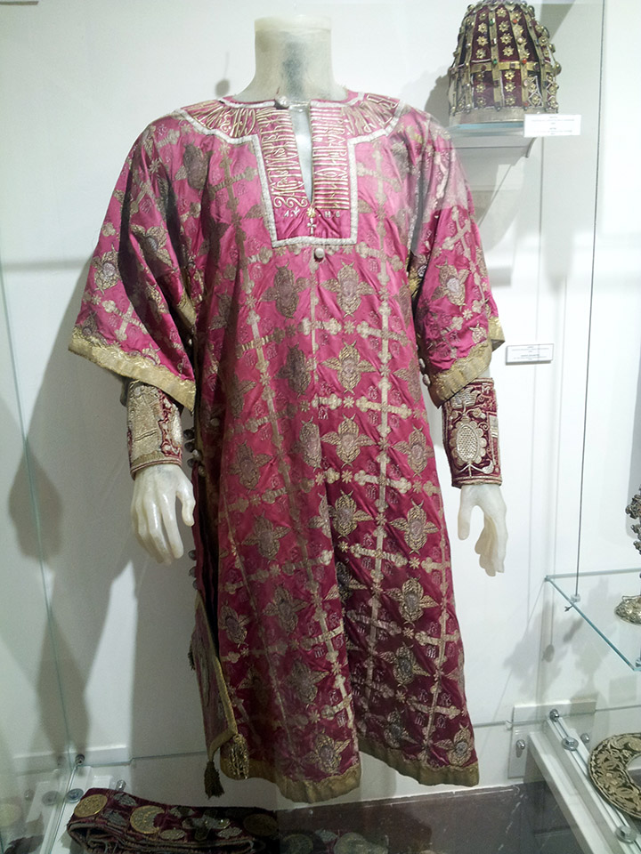 Posebnu pažnju izazvala je haljina (ogrtač) kneza Lazara načinjena prije 1389. godine. Na njoj se nalaze heraldički znaci, lavovi u dvostrukom žakar-tkanju, a šlem sa volovskim rogovima stavljen je na dugme urađeno tehnikom emajla. Ovaj heraldički znak je zastupljen na novcu i pečatima kneza Lazara. Haljina je original i na njoj se nalazi samo jedno ovakvo dugme.