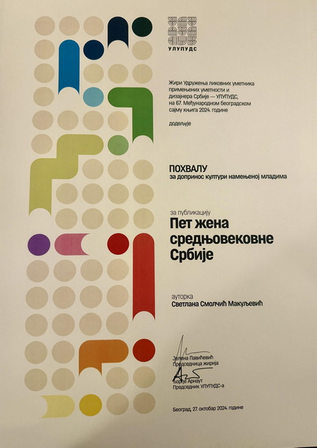 31.10.2024.Na ovogodišnjem 67. Medjunarodnom beogradskom sajmu knjiga nacionalna monografska studija naše profesorke istorije umetnosti i dizajna dr Svetlane Smolčić Makuljević „Pet žena srednjovekovne Srbije“ u izdanju Zavoda za udžbenike medju mnogobrojnim kvalitetnim publikacijama dobila je prestižnu nagradu ULUPUDS-a Pohvalu za kulturu namenjenu mladima.