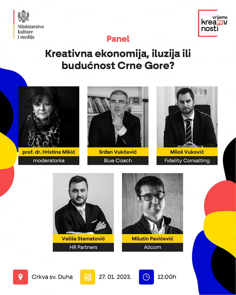 Prof. Hristina Mikić, sa Fakulteta za menadžment Univerziteta Metropolitan, vodila je uvodni panel “Kreativna ekonomija: budućnost, ili iluzija Crne Gore”, a u razgovoru sa njom učestvovali su: Srđan Vukčević direktor Blue Coach, Miloš Vuković direktor Fidelity Consulting, Veliša Stamatović direktor HR Partners i Milutin Pavićević direktor Alicorna. Učesnici su kreativnu Crnu Goru 2030 videli kao kreativnu naciju, kreativno društvo koje nudi jednake mogućnosti za sve i u kome su građani srećni, i kao “maštalište” za umetnike.