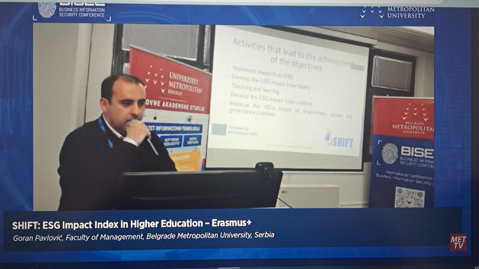 16.12.2024.Univerzitet Metropolitan je 29. novembra 2024. godine organizovao prezentaciju projekta „SHIFT: ESG Impact Index in Higher Education“ na konferenciji BISEC'2024 u Nišu. Na ovom događaju, koji je održan u okviru konferencije u periodu od 28.-29.11.2024, profesor Goran Pavlović je podelio najnovije informacije o napretku i postignućima na samom projektu. SHIFT je pionirski projekat koji ima za cilj unapređenje kapaciteta visokoobrazovnih ustanova da doprinesu ostvarivanju ciljeva održivog razvoja. Navedeno se postiže implementacijom strategija i politika u oblastima životne sredine, društva i upravljanja (ESG), uz podršku ESG Impact Index platforme, koja predstavlja krajnji rezultat projekta. Ova platforma obezbeđuje ključne alate visokoobrazovnim ustanovama za proces analize, implementacije i kontrole ESG principa i njihovih rezultata, sa ciljem da studentima, profesorima, istraživačima i drugom osoblju pruži neophodno znanje koje će doprineti održivom razvoju.