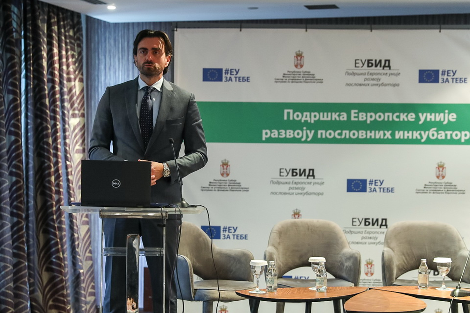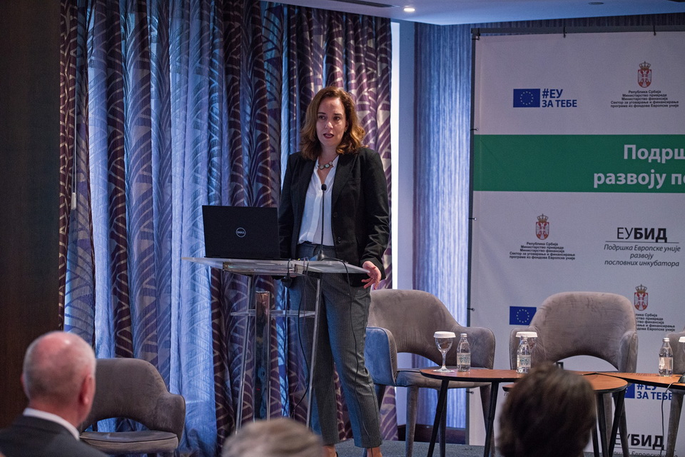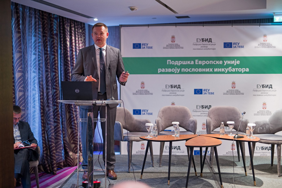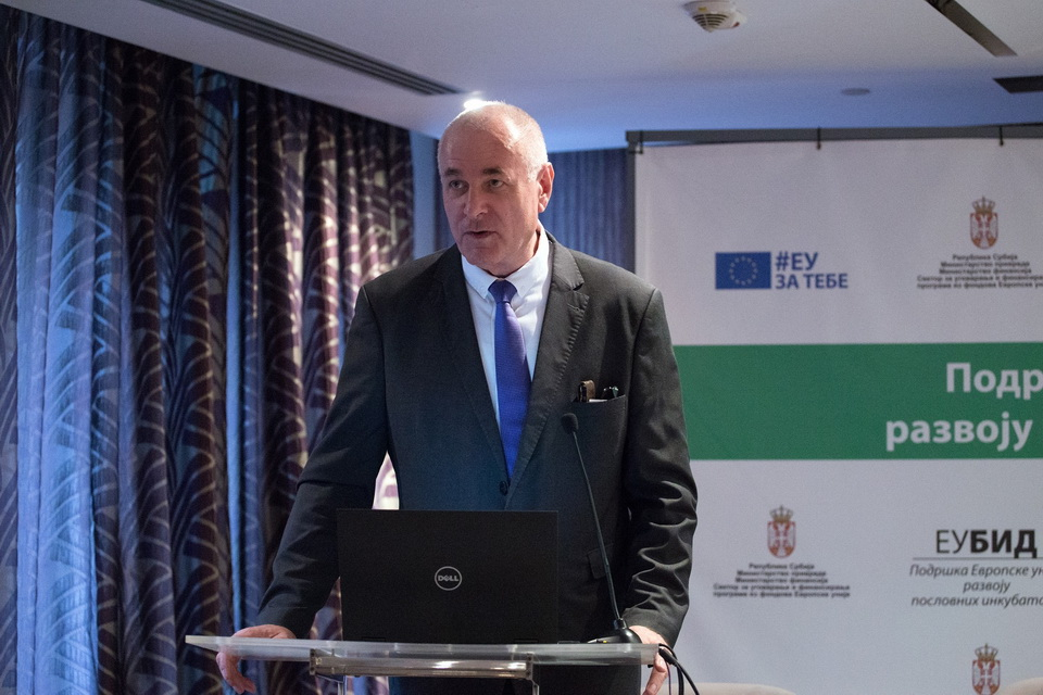 Gospodin Karl-Heinz Jach, rukovodilac EUBID projekta, najpre je izneo rezultate analize dosadašnjeg razvoja poslovnih inkubatora u Srbiji, pri čemu je istakao da je 2006. godine postojalo 5 poslovnih inkubatora, dok je 2019. godine taj broj narastao do 40 inkubatora i 14 regionalnih startap centara formiranih u Srbiji. Zatim su usledile preporuke da se u narednom periodu treba fokusirati na unapređenje usluga podrške razvoju poslovanja korisnika poslovnih inkubatora (treninge, radionice, konferencije i mentorstva). Startapovi koji se razvijaju u poslovnim inkubatorima najčešće su inovativna preduzeća kojima je važna kvalitetna podrška u početnim fazama razvoja kako bi uspešno razvili svoju ideju i plasirali se na tržište. Kao najvažniji faktori za uspešno poslovanje istaknuti su preduzetnički duh, preuzimanje rizika, menadžerska sposobnost, kreiranje strategija, umrežavanje i partnerstva.