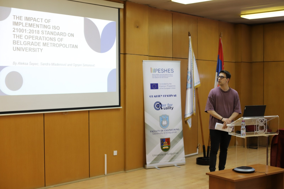 27.05.2025.Na međunarodnoj konferenciji Festival kvaliteta 2025, koja se tradicionalno održava u organizaciji Centra za kvalitet Fakulteta inženjerskih nauka Univerziteta u Kragujevcu, studenti Fakulteta za menadžment Univerziteta Metropolitan Beograd, Aleksa Šepec, Sandra Mladenović i Ognjen Simonović uspešno su predstavili svoj istraživački rad pod naslovom „The Impact of Implementing ISO 21001:2018 Standard on the Operations of Belgrade Metropolitan University“.