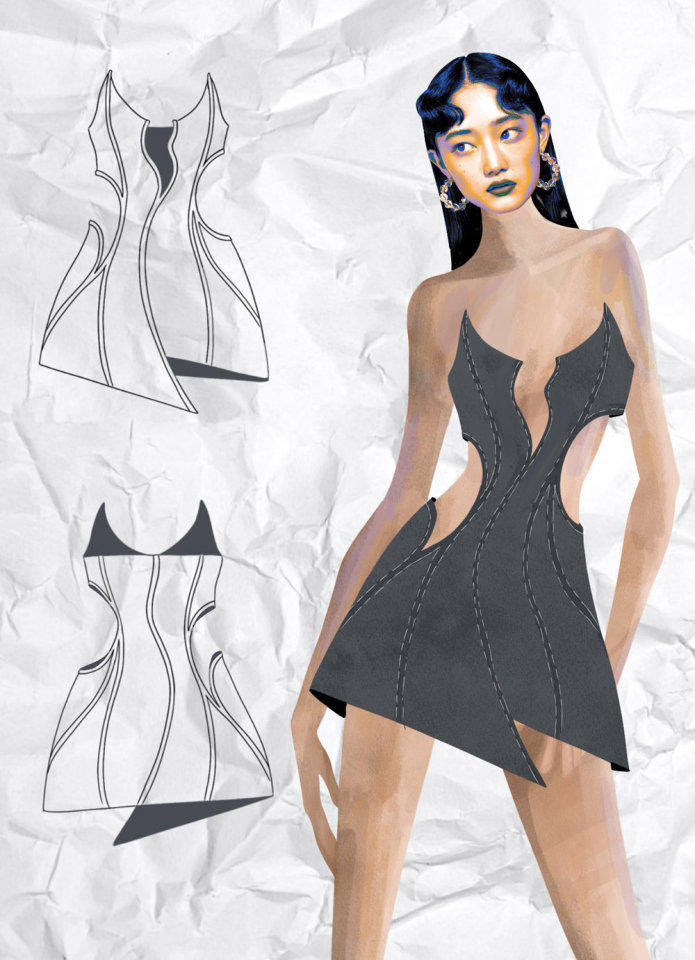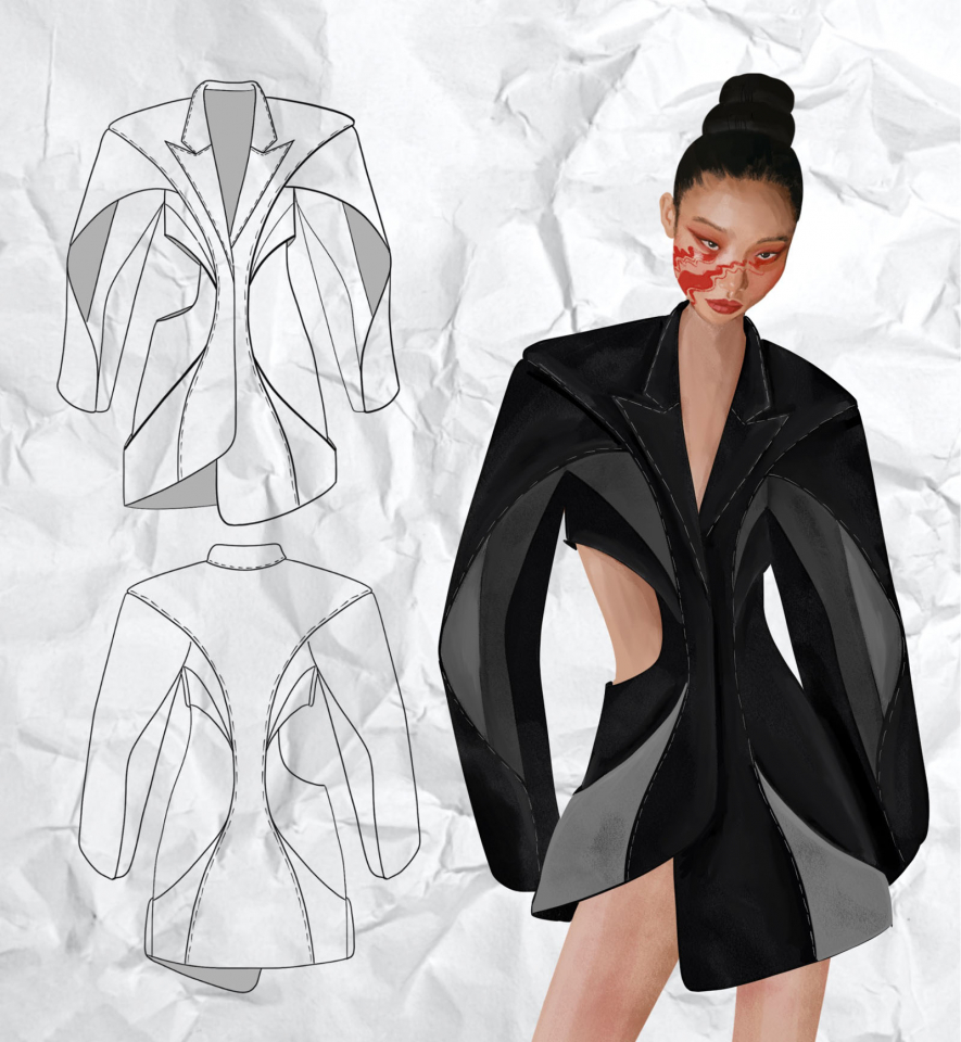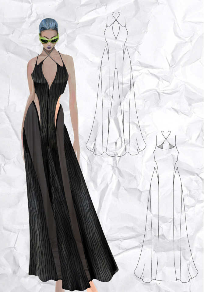 ‘’Što se kolekcije tiče, za inspiraciju sam uzela crno-bele fotografije, koje u svom sadržaju imaju elemente kontrasta, čvrstoće, asimetrije, emocija i ulice. Ovi elementi se kroz alegoriju oslikavaju u silueti, strukturi, materijalima i dizajnu samih modela. Htela sam da moja prva kolekcija bude lična i da se projektuje kroz neku moju realnost. U ovom periodu mog života i kroz istraživanje ovih fotografija, došla sam do zaključka da ništa nije u ekstremu, već sve postoji u etru, u međuprostoru svetlosti i tame. Postojanje leži u nijansama. Sivi tonovi ahromatske fotografije, kao balans realnosti, inspiriše moj cilj dostizanja ekvilibrijuma.’’