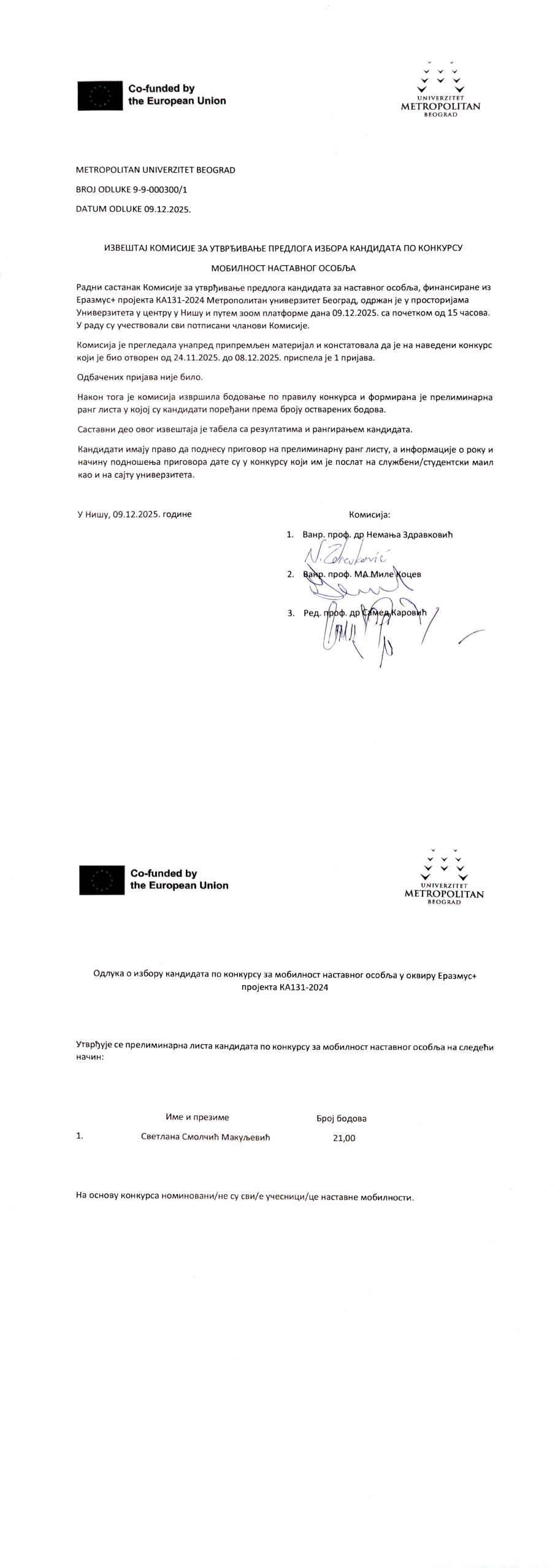 Izveštaj komisije i preliminarna rang lista – Konkurs za mobilnost nastavnog osoblja – novembar 2025.