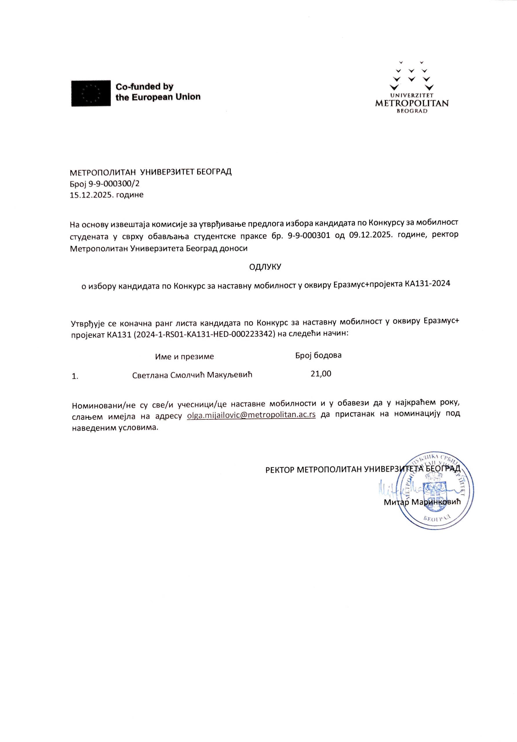 ODLUKA – o izboru kandidata po konkursu za mobilnost nastavnog osoblja – novembar 2025.