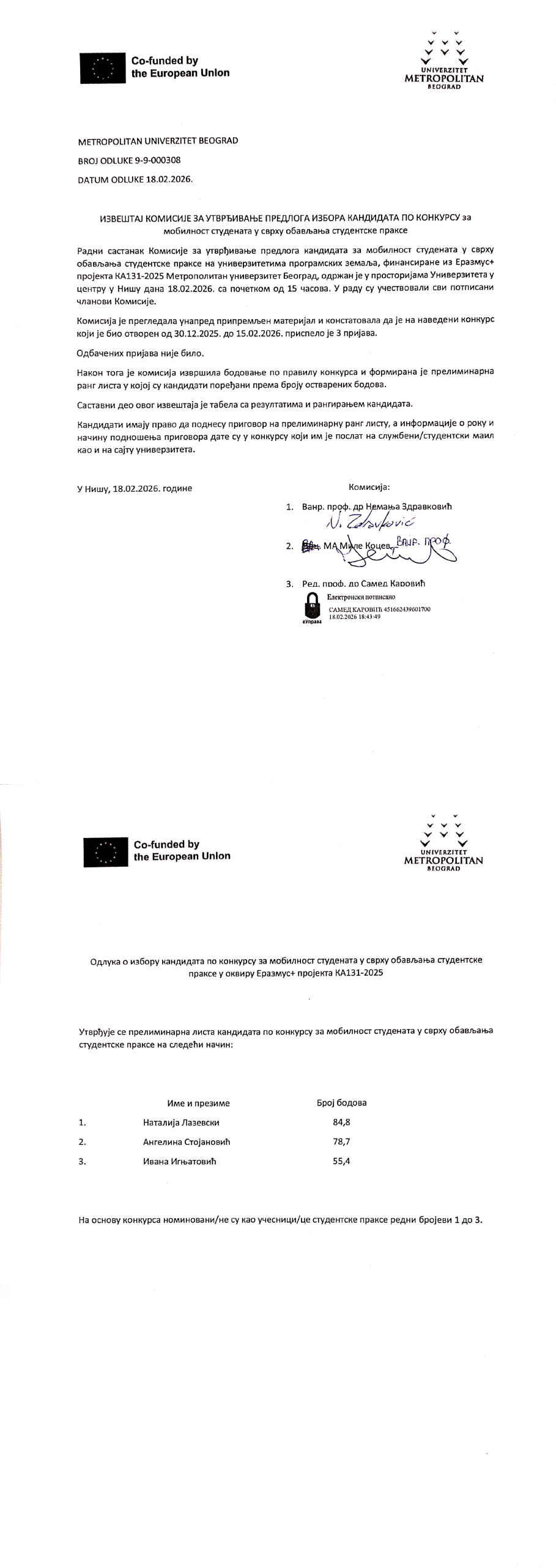 Izveštaj komisije i preliminarna rang lista – Konkurs za Mobilnost studenata u svrhu obavljanja studentske prakse – septembar 2025